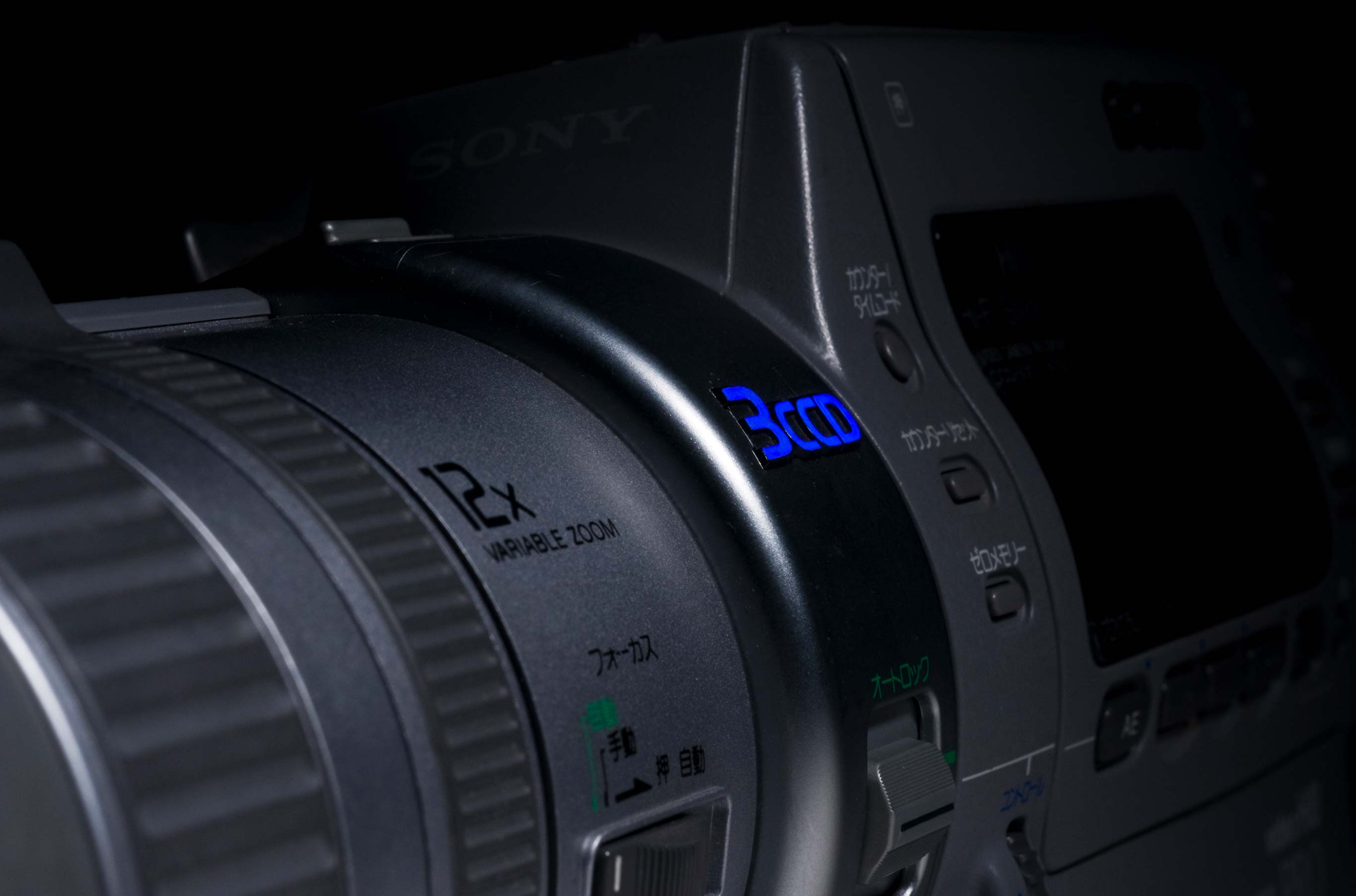 民生用として世界初の3CCDシステムを搭載し、プロ用ビデオカメラに迫る画質を実現したハンディカム(ソニー製コンパクトビデオカメラ)プロ。キャリングハンドル装備、レンズ軸に沿ってシリンドリカルにダイヤル、スイッチを配置し、新しいビデオ撮影フィールドを開拓した。