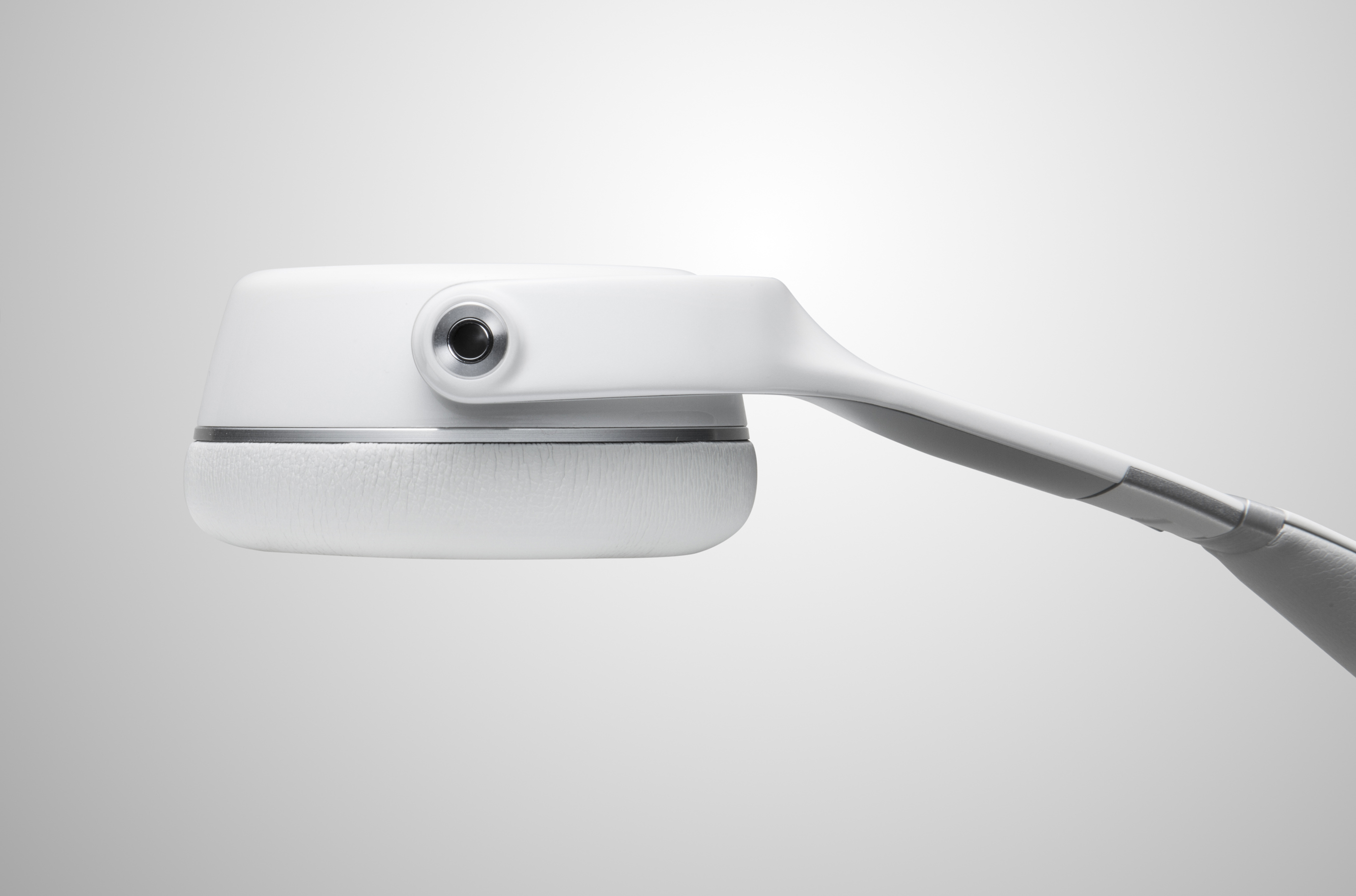 ヘッドバンドから回転ヒンジへと続く流れるような造形は、ハウジングの回転軸に求められる角度へのアプローチをシンプルかつ必然的に構成するだけでなく、髪が前から後ろへと流れる優雅なラインと美しく調和することを意図している。