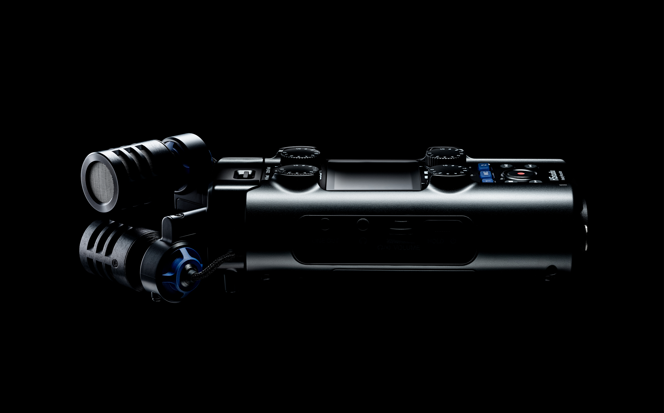 映像や音楽の作品を生み出すプロフェッショナル・クリエイターのためにデザインされた、最高水準のオーディオを約束するスタジオ品質のハンディレコーダー。業界初の19.4mm大口径ステレオマイクを採用しながら、セット全体を必然的な造形構成とする事で、統一感、凝縮感、高い操作性を生み出している。