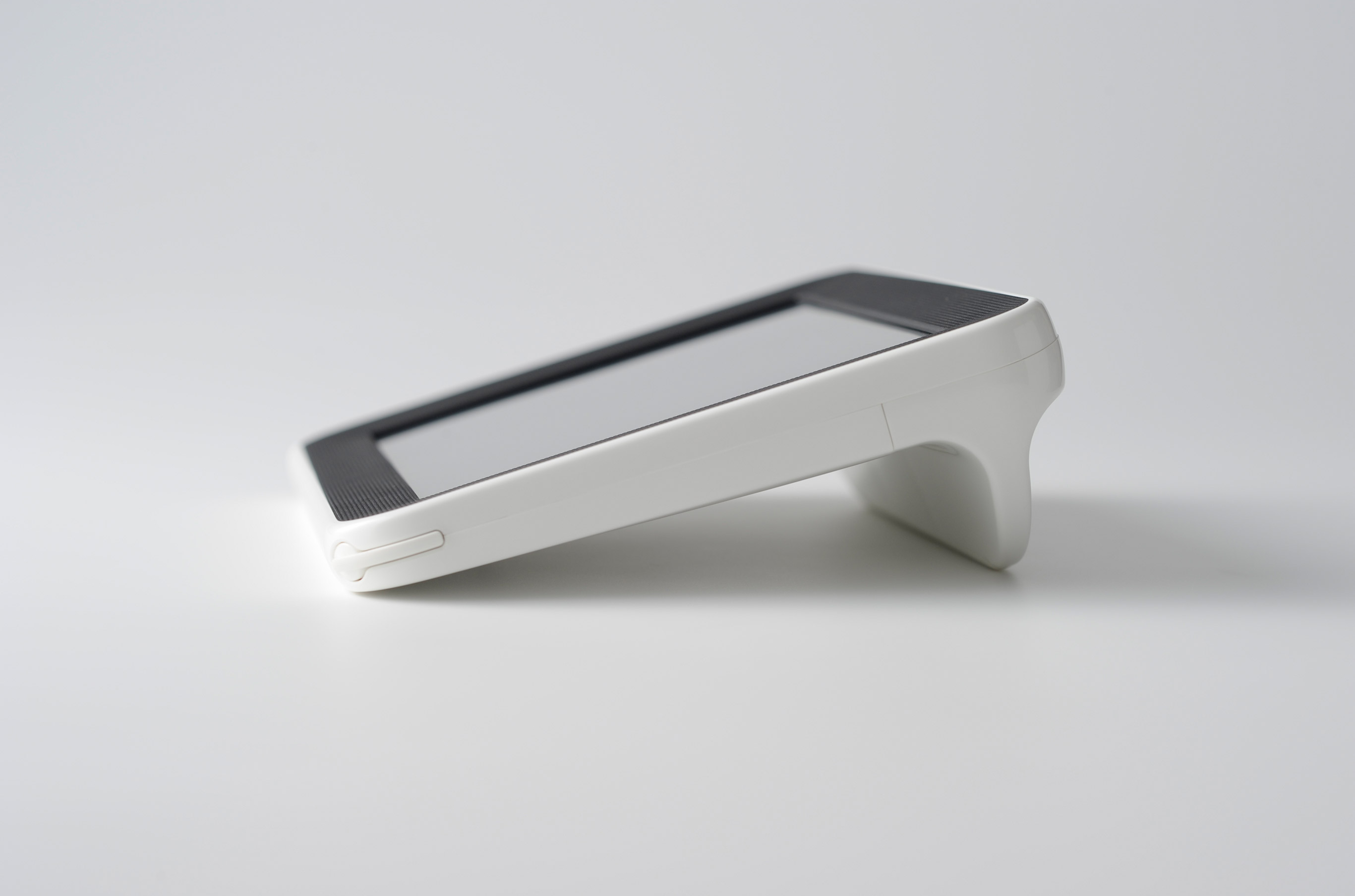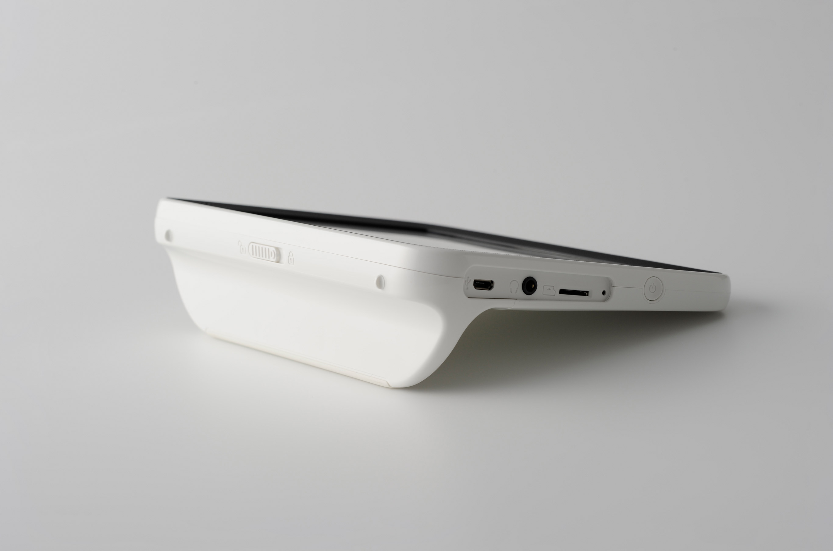 Benesse製の学習用タブレット。中学生の勉強を、紙のテキストやノートと同時に補助するタブレット端末という製品特性上、デスクトップで立てた状態でも見やすい角度、手元近くに置いても書き易い角度、ホールドのし易さを一つの造形で同時に実現する事を考えた。