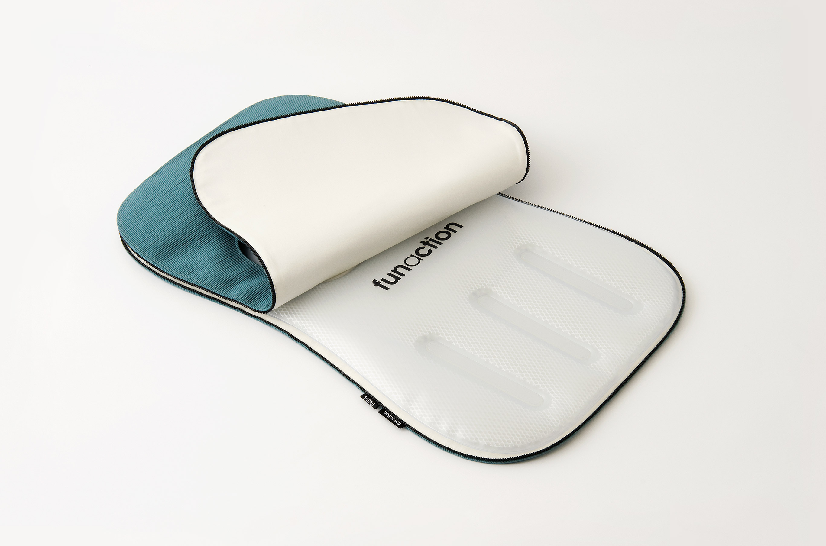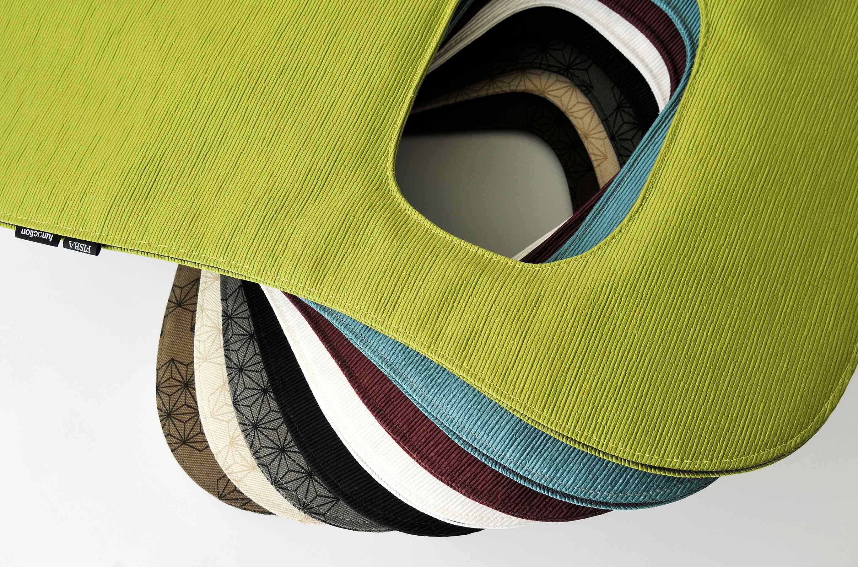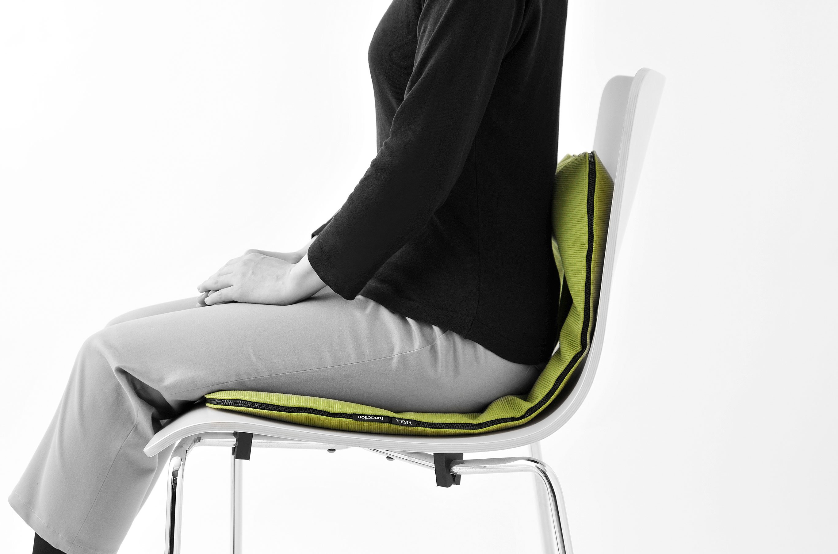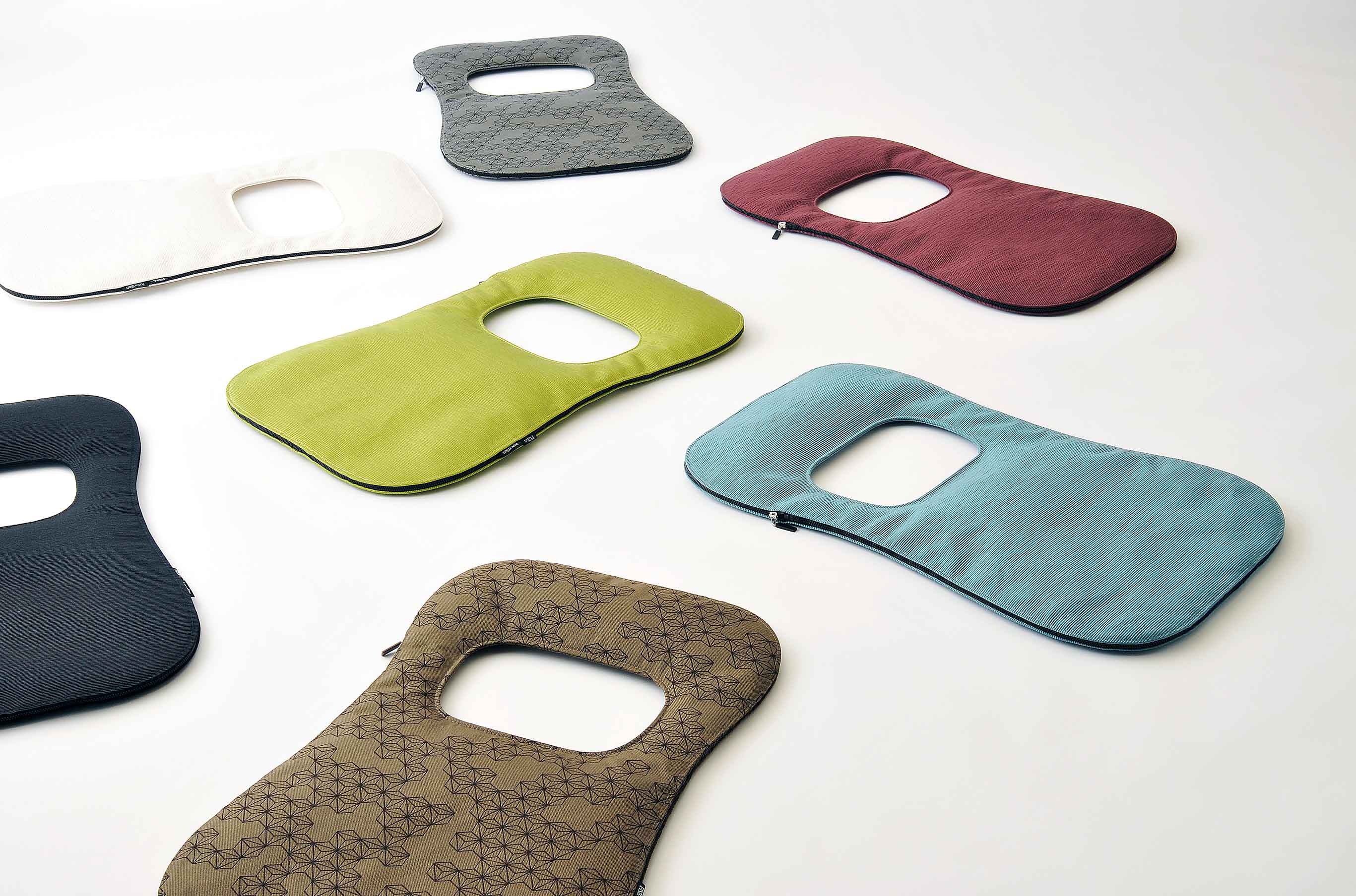 移動するエアーが腰をサポートし、正しい座り姿勢の維持、快適な座り心地を実現する“機能するクッション”です。“座る”という単純な行為によって腰部分をサポートする為に必要な膨らみを生み出す。ファブリックはクリスチャン・フィッシュバッハ(日本FISBA)社とのコラボレーションにより、100%ペットボトルリサイクル生地「Benu」を使用。